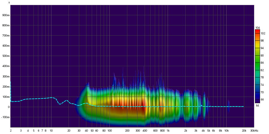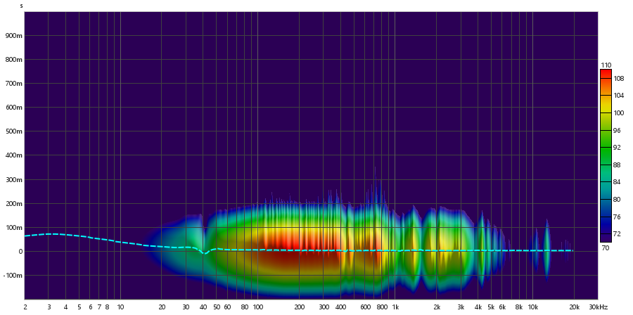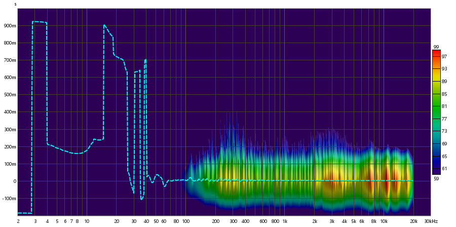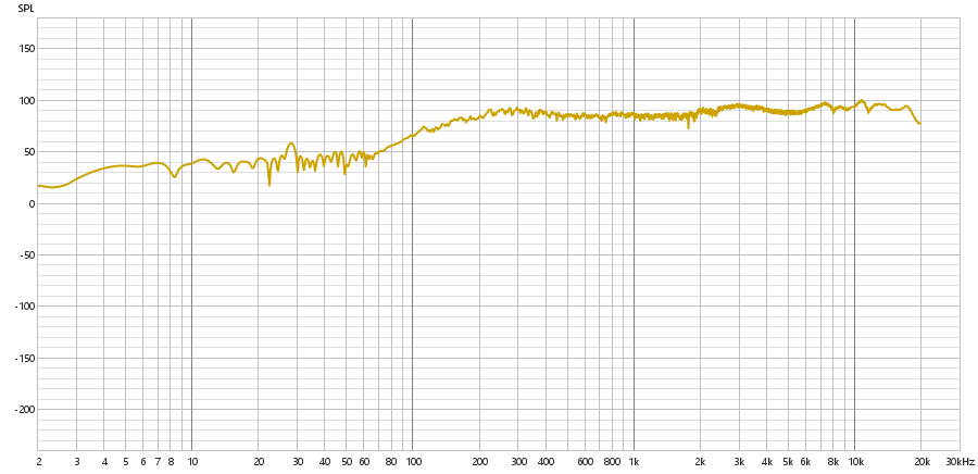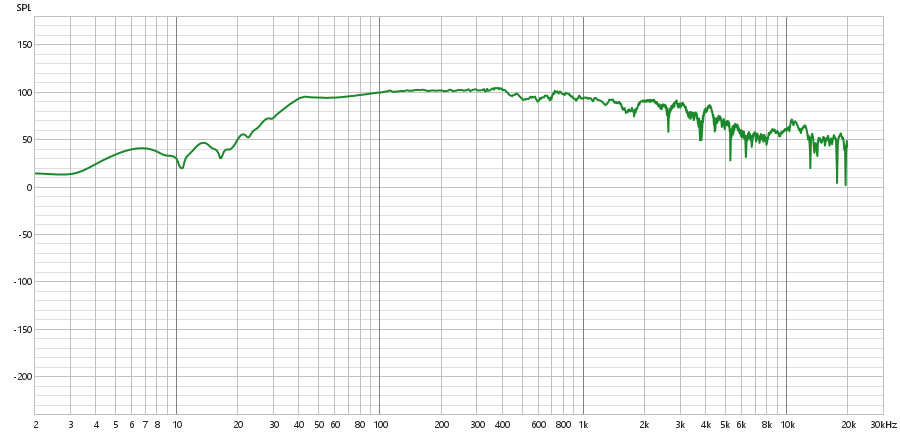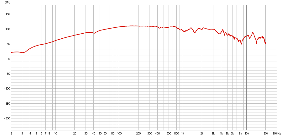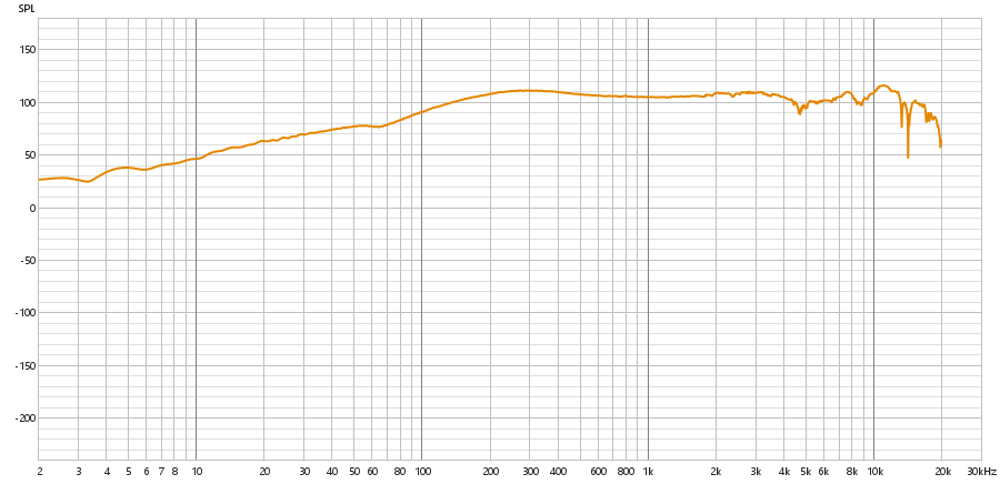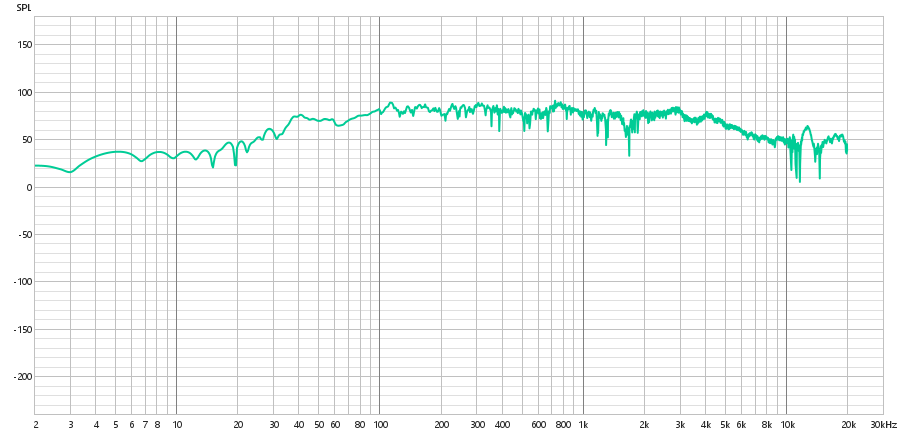 Diferente do tweeter, o subwoofer não apresenta um crescimento linear em nenhum ponto, mas a partir dos 3 Hz, começa a apresentar um crescimento acentuado em formato de curva, que se estende até cerca de 500 Hz. Com esse formato de curva, adquire um comportamento oscilatório até 8 kHz. Neste ponto, assume um comportamento completamente oscilatório, sem acompanhar a curva anterior.