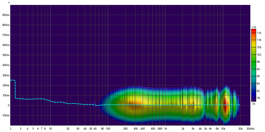 Em contrapartida, o tweeter possui o crescimento acontecendo até 1 kHz, sendo que as componentes de frequência se mostram constantes na faixa de 1 kHz a 10 kHz. Existe uma oscilação perceptível na faixa de 10 kHz a 20 kHz.